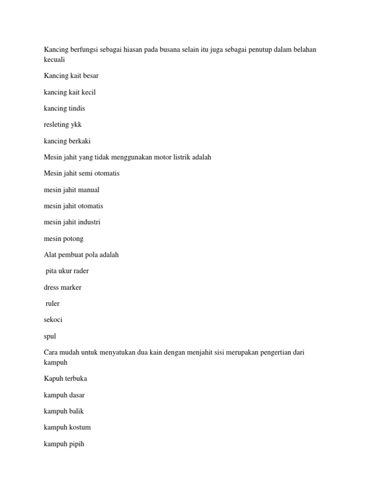 Istila Umum Dalam Jahit Menjahit Elmodista from elmodista.com Bicara soal paus, tahukah kamu ada berapa macam paus yang ada di bumi ini? Pastikan lebar kainnya berapa, lalu buat simulasi diatas lantai/meja besar, tempelkan. Siapa yang berenang paling lamban? Adalah cara termudah untuk menyatukan dua kain dengan menjahit sisi buruknya. Ada berapa macam jahit kampuh : Sebutkan 2 jenis penggaris untuk pembuatan pola. At this point, sobat pintar tentu dapat menyebutkan berapa lama waktu yang dibutuhkan untuk kuliah dan meraih gelar sarjana. Ada berapa tingkat pendidikan vokasi?